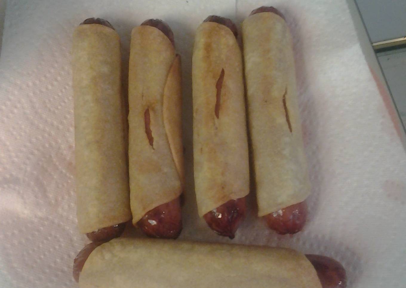 - Cook making 1/4 turns until each side is crispy (cooking at medium heat will heat the dogs with out the burning the tortilla.)